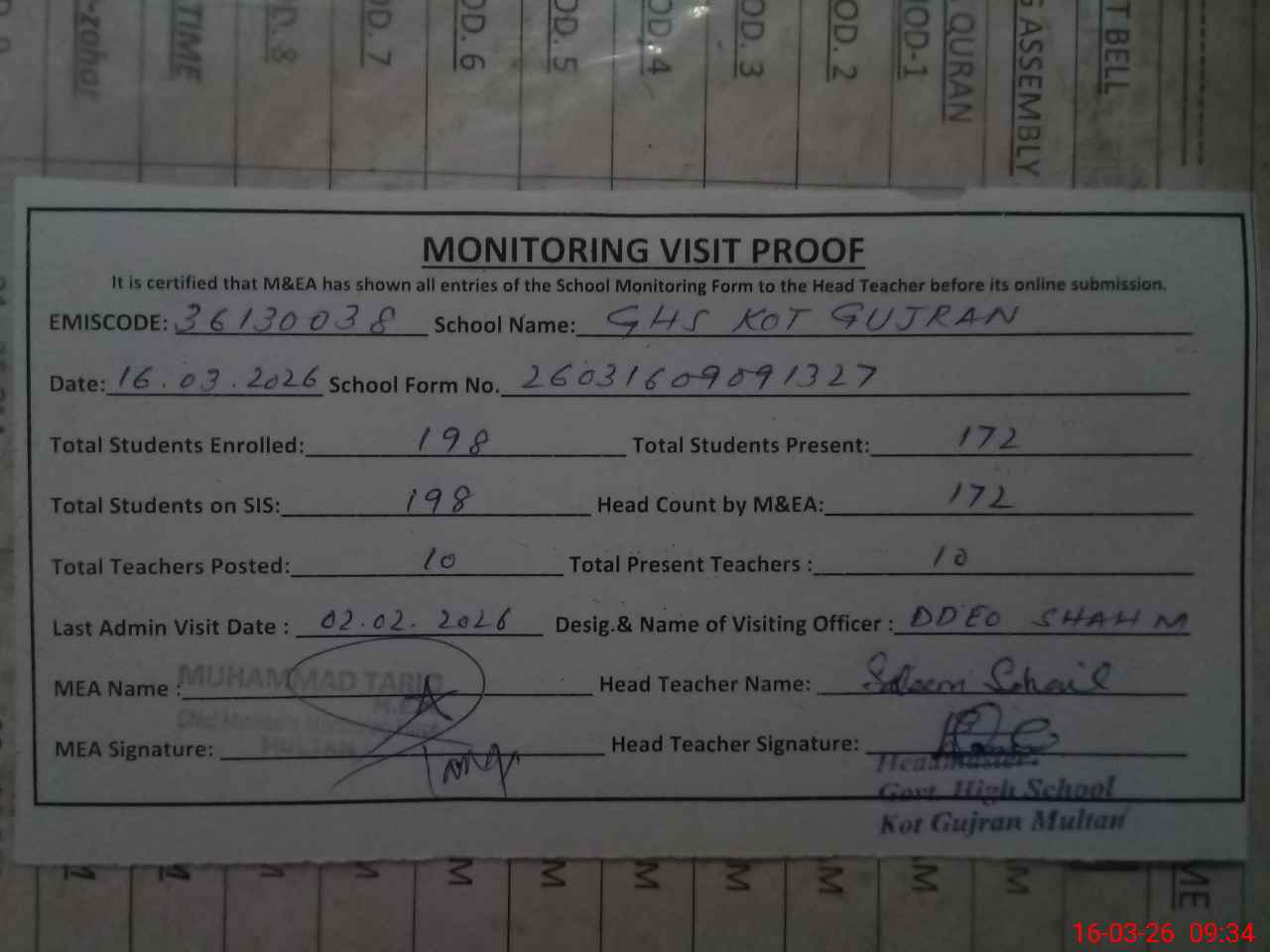 | EMIS Code: 36130038 | Name of School: GHS KOT GUJRAN MULTAN | |||