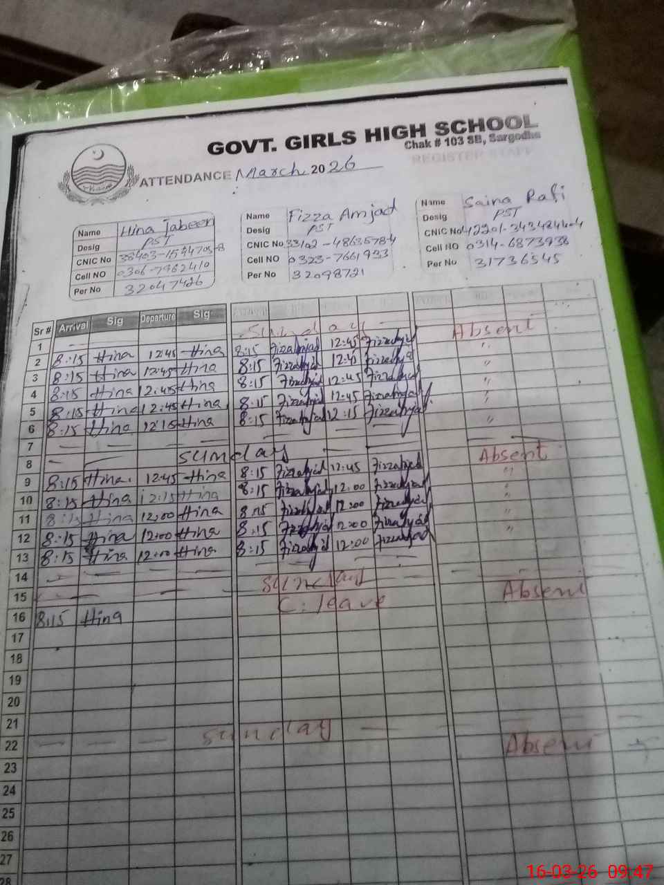 | CNIC | Full Name | Designation | R/C | Absence During Last Calender Month |