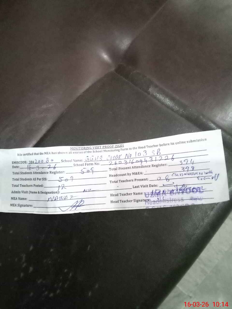 | Attendance Register | Head Teacher | MEA with School | Visit Proof |
