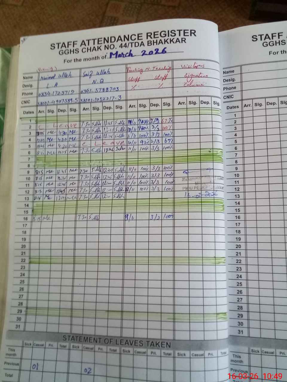 | CNIC | Full Name | Designation | R/C | Absence During Last Calender Month |
