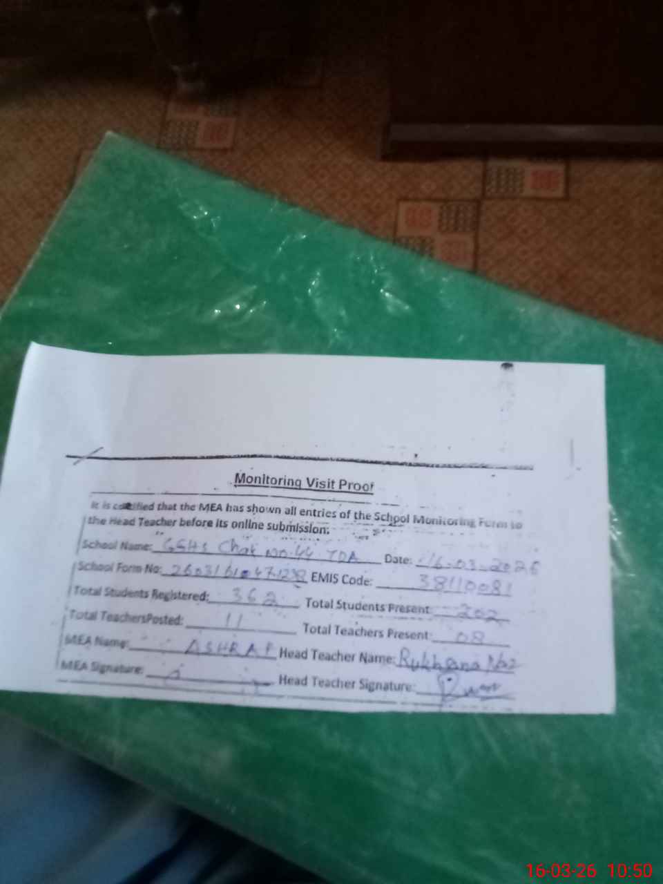| Attendance Register | Head Teacher | MEA with School | Visit Proof |