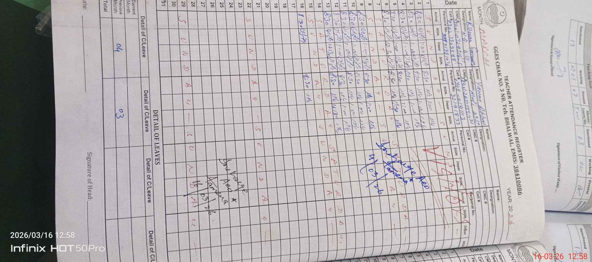 | Name: NU**** RA**** Designation: (School Headmaster's/Headmistress's) S.S.T.(ARTS) Phone/Cell Number: 03**** |