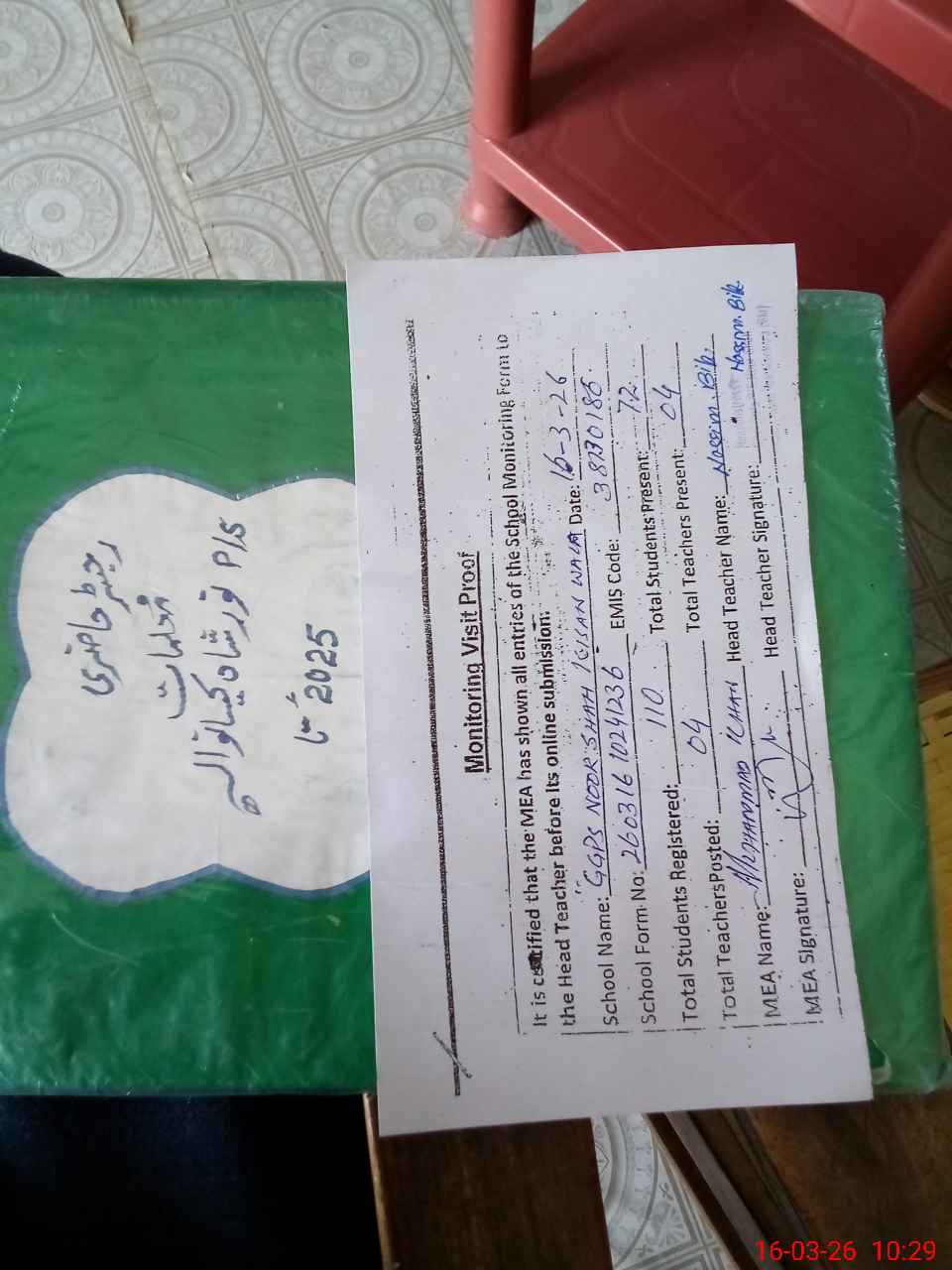 | Attendance Register | Head Teacher | MEA with School | Visit Proof |