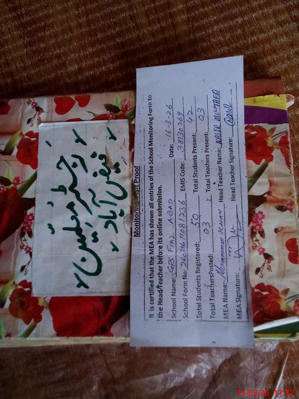 | Attendance Register | Head Teacher | MEA with School | Visit Proof |