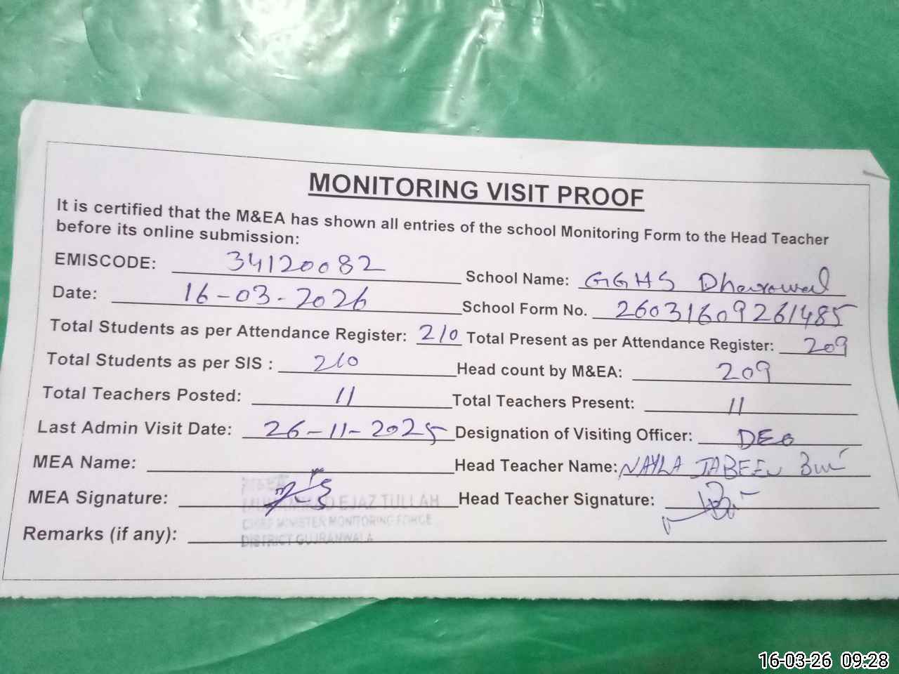 | EMIS Code: 34120082 | Name of School: GGHS DHARO WAL | |||