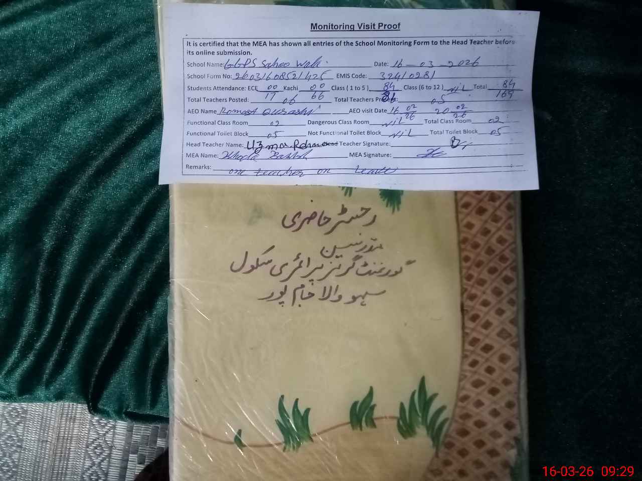 | Attendance Register | Head Teacher | MEA with School | Visit Proof |