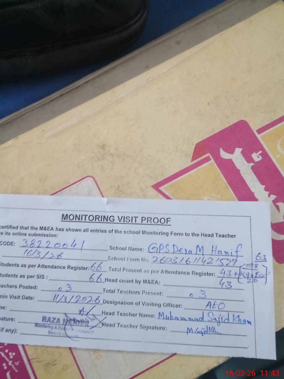 | Attendance Register | Head Teacher | MEA with School | Visit Proof |