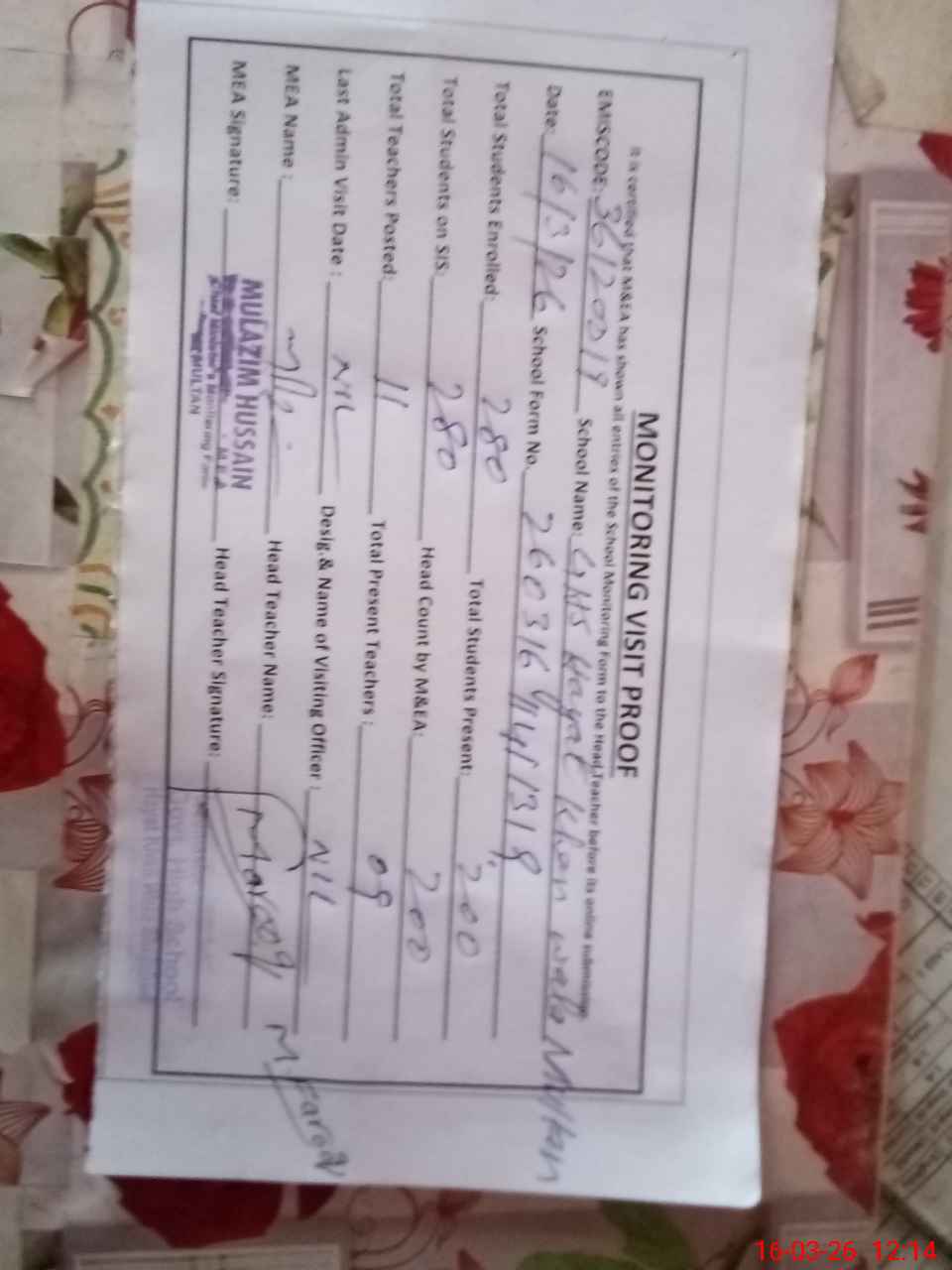 | Remarks (Use Separate Page if Required): 02 teacher khurshid and tehzeeb absent as no proof in school to apply white wash required in some places 03 toilet non functional ece and nursery on vacation so strength is less | |||||