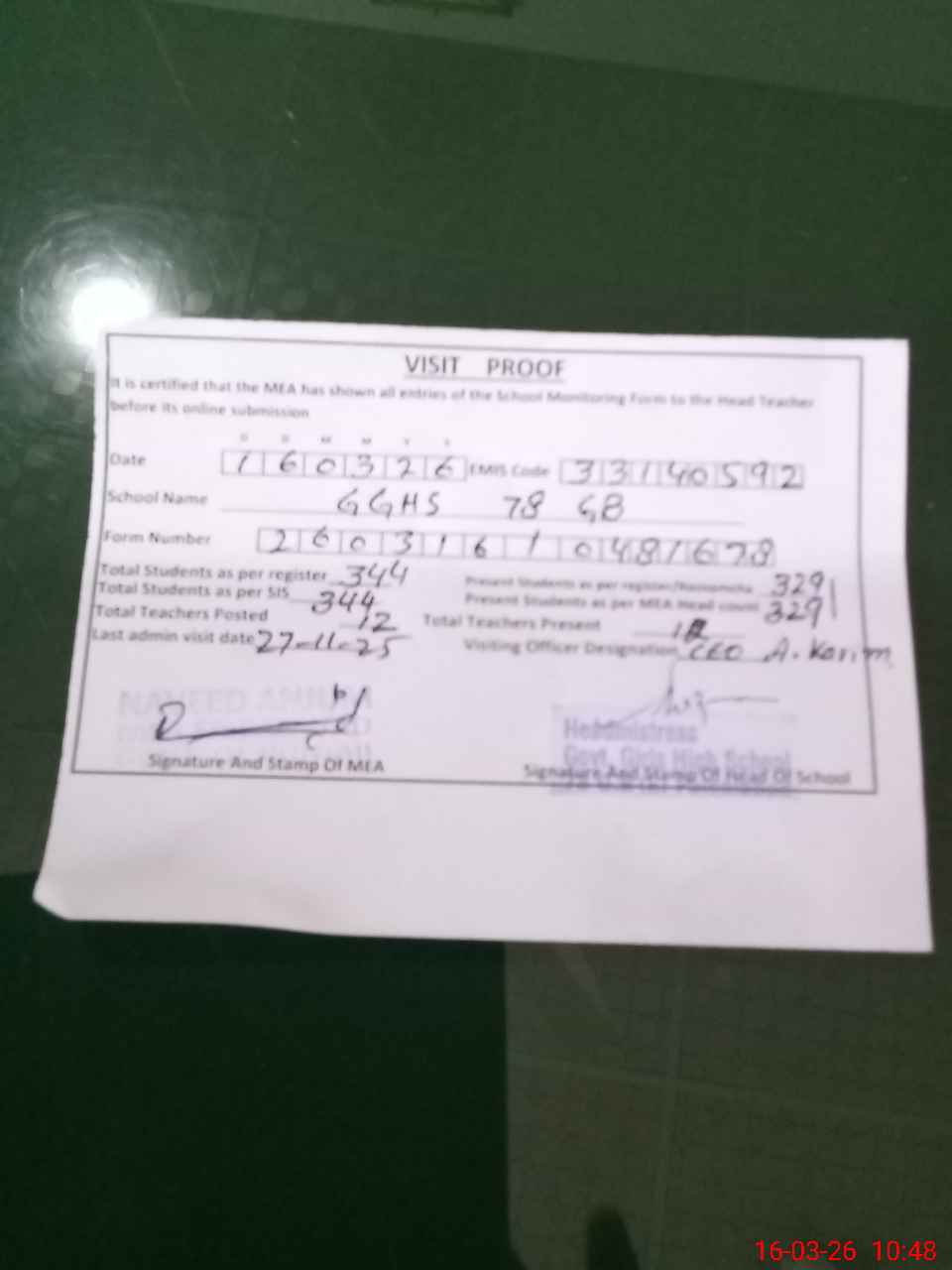 | Certified that this School was Inspected by the Undersigned MEA/DMO Today and the Information Stated Above is as Per Record. | |||||