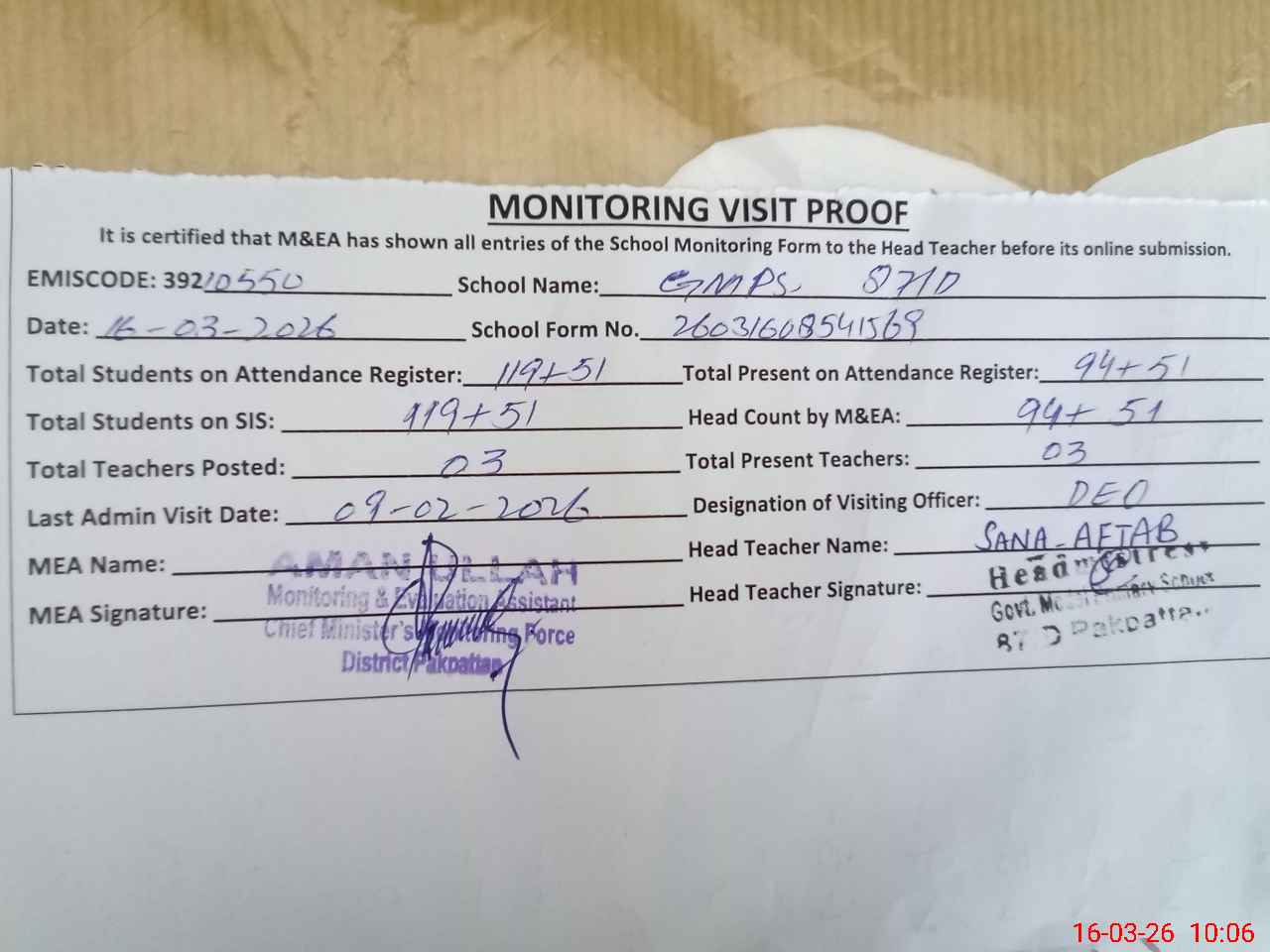 | Certified that this School was Inspected by the Undersigned MEA/DMO Today and the Information Stated Above is as Per Record. | |||||
