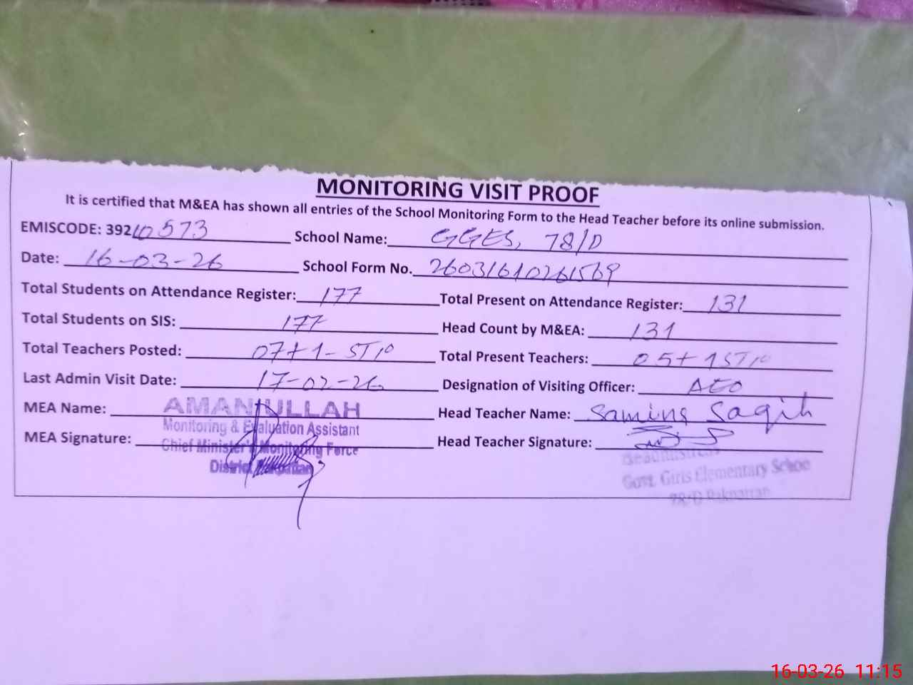 | Attendance Register | Head Teacher | MEA with School | Visit Proof |
