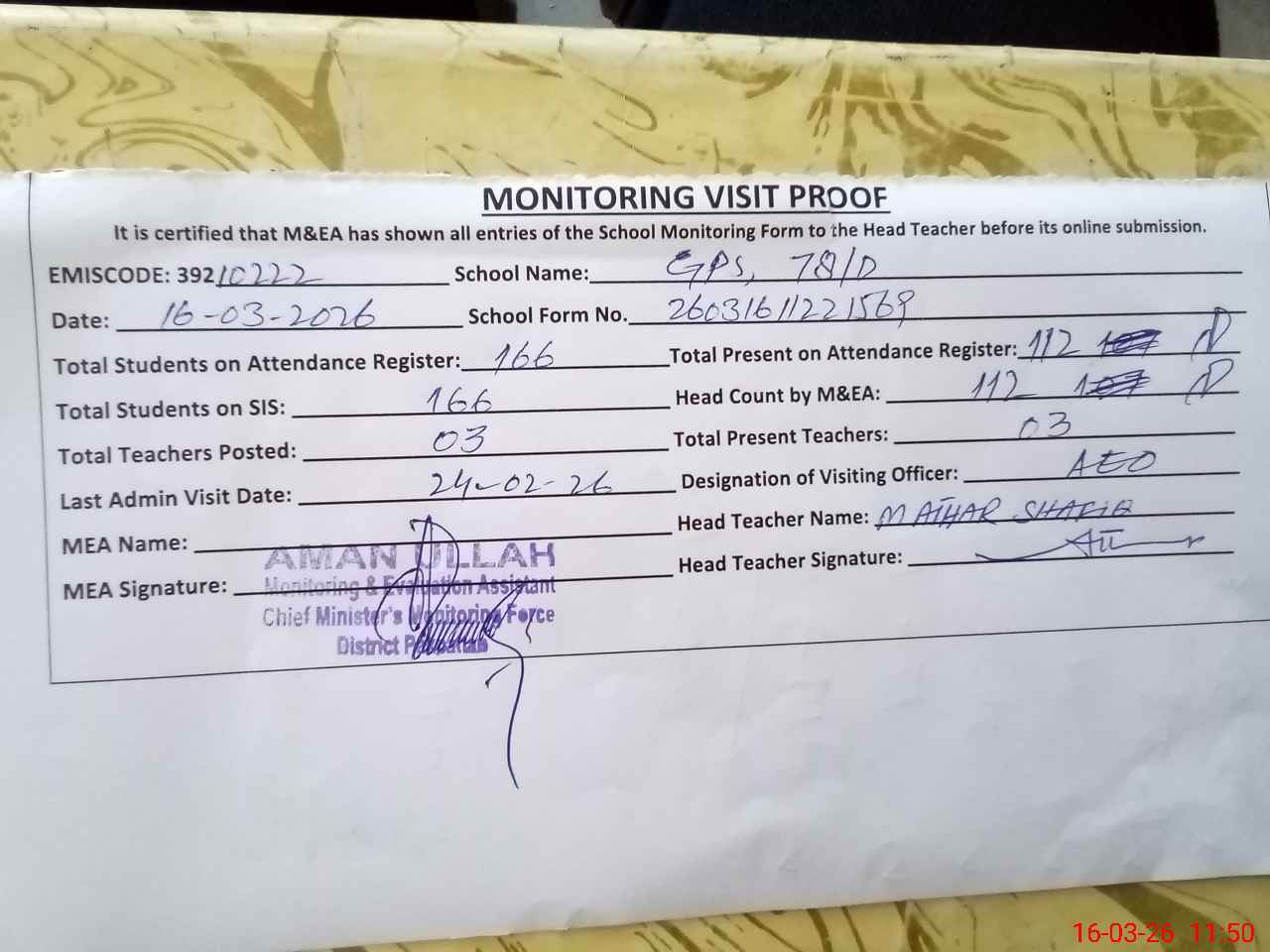 | EMIS Code: 39210222 | Name of School: GPS CHAK NO. 78/D | |||