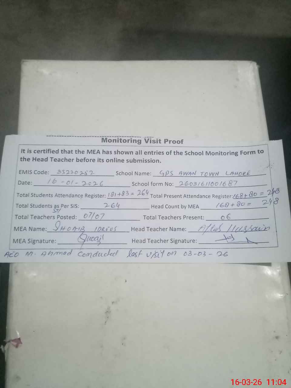 | EMIS Code: 35220252 | Name of School: GPS AWAN TOWN LAHORE | |||
