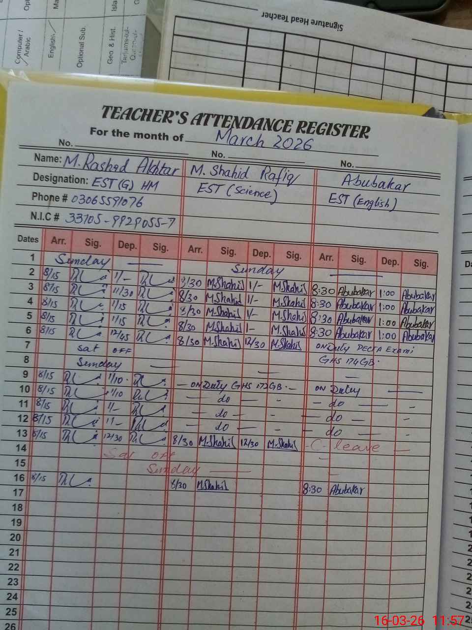 | CNIC | Full Name | Designation | R/C | Absence During Last Calender Month |
