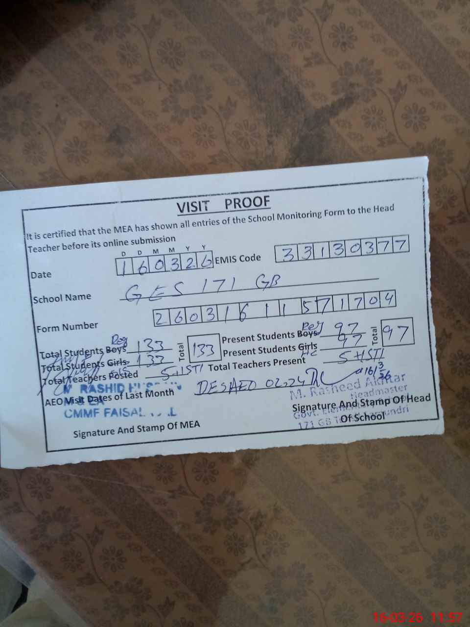 | Attendance Register | Head Teacher | MEA with School | Visit Proof |