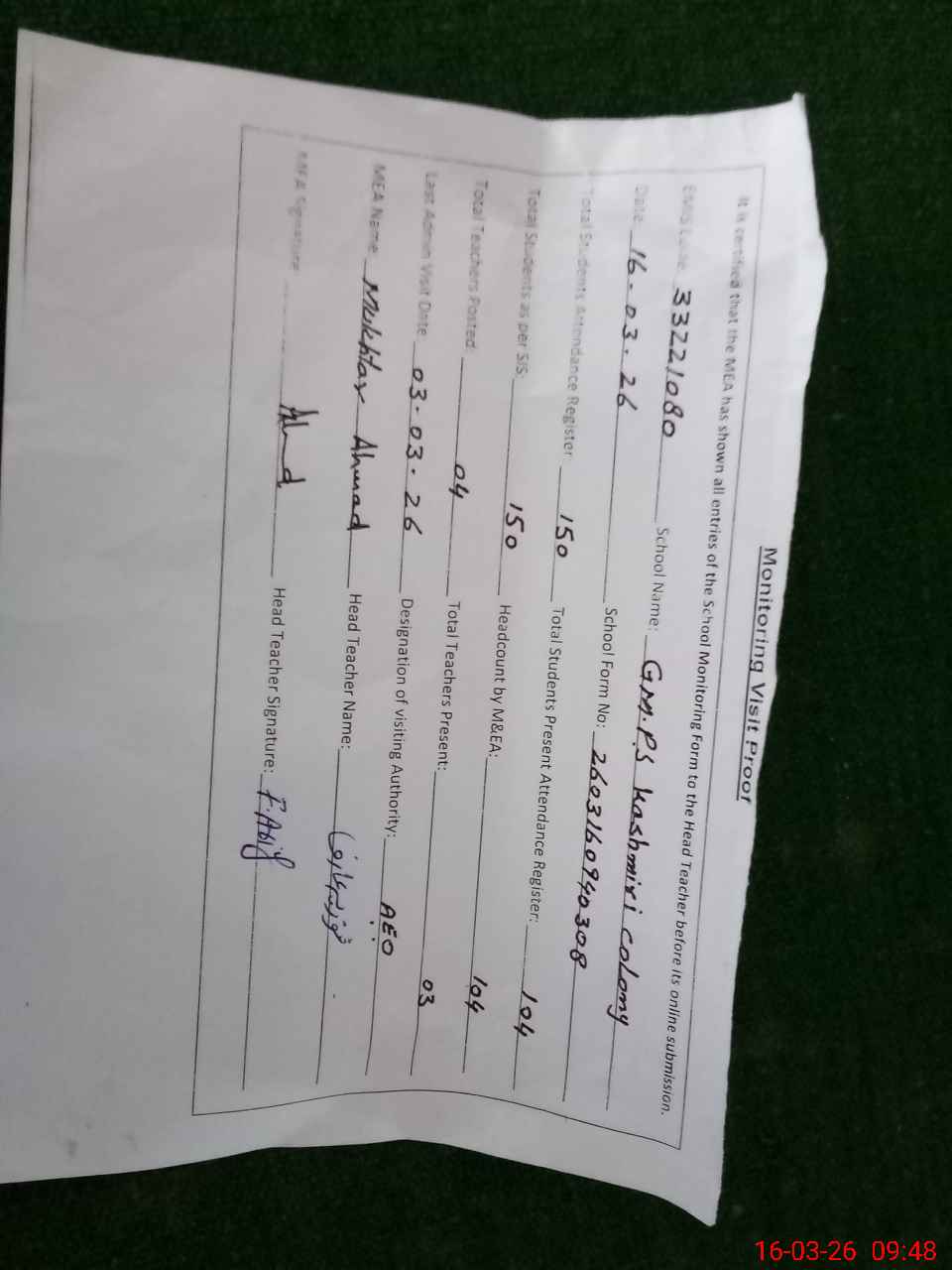 | Attendance Register | Head Teacher | MEA with School | Visit Proof |