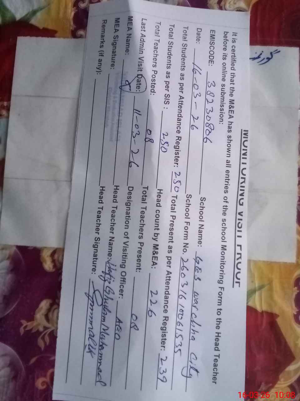 | Attendance Register | Head Teacher | MEA with School | Visit Proof |