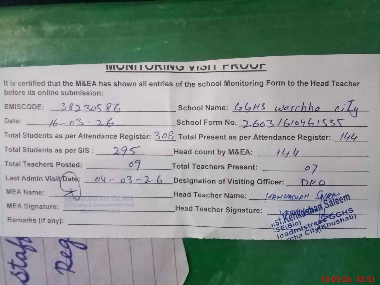 | Remarks (Use Separate Page if Required): DEO visited school on 4 March 2026 signature available only on teacher attendance register not in log book students strength on sis 295 matel detector not in working condition | |||||