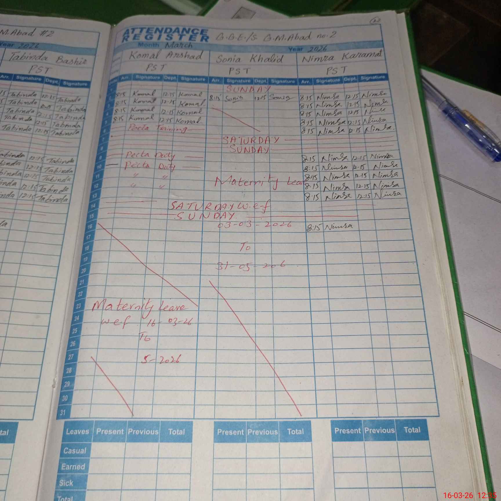 | Leave | Duty | Absent | Maternity | Medical | Ex- Pak |
