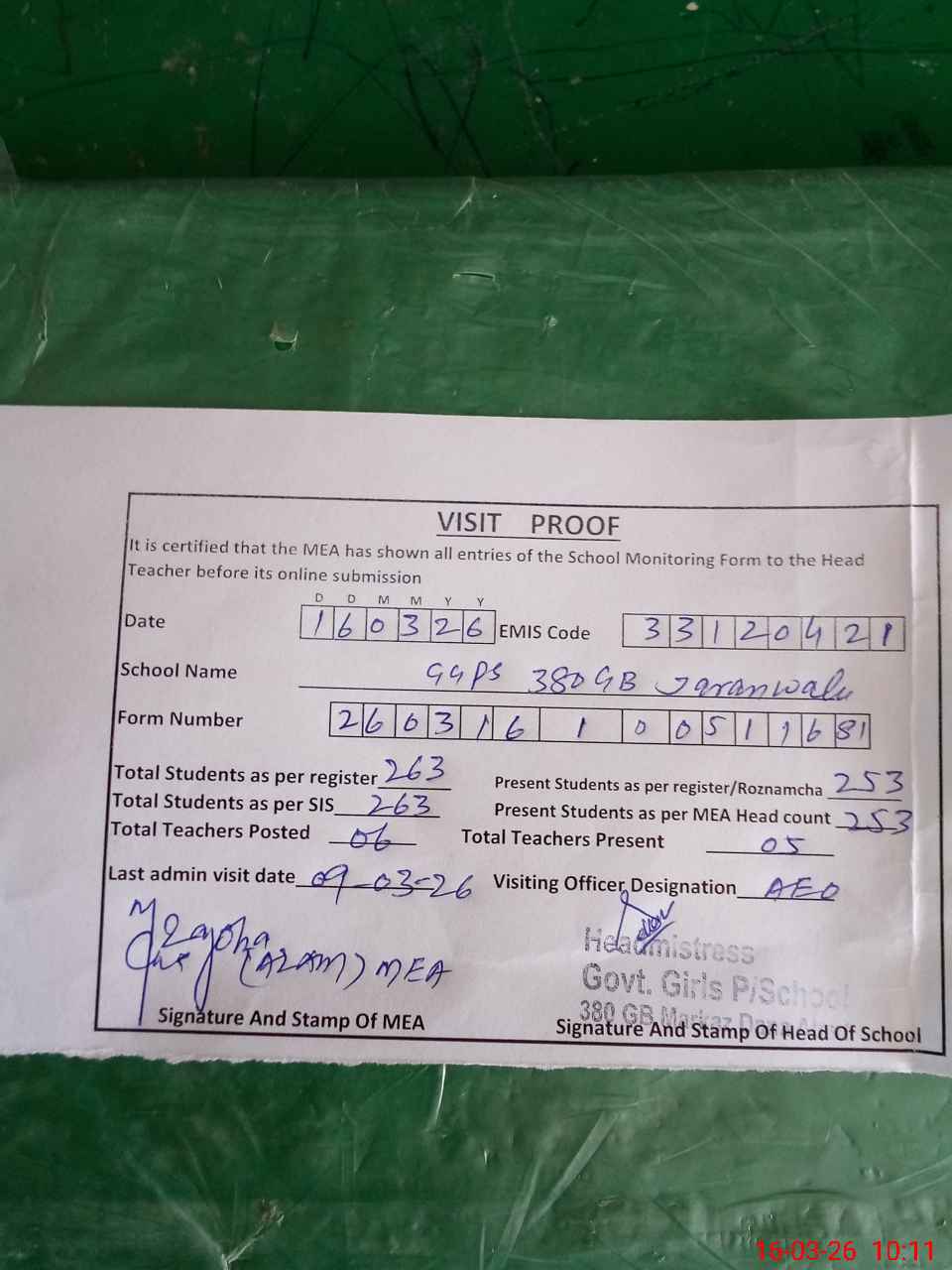 | Attendance Register | Head Teacher | MEA with School | Visit Proof |
