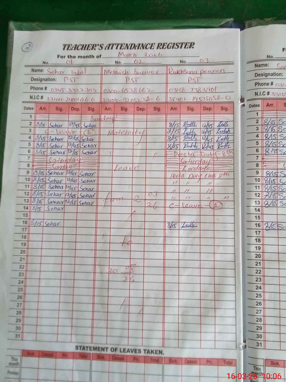 | CNIC | Full Name | Designation | R/C | Absence During Last Calender Month |