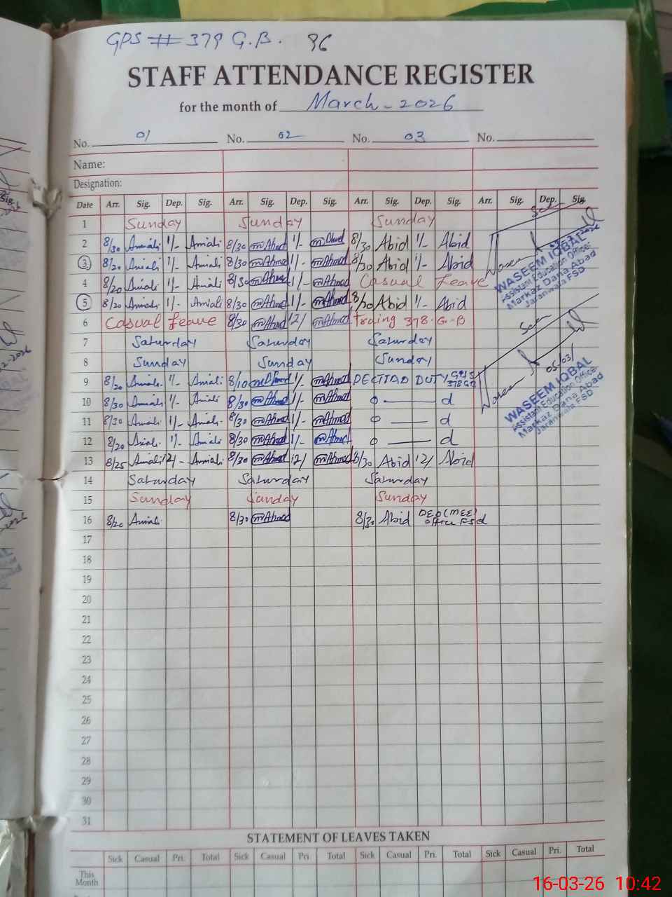 | CNIC | Full Name | Designation | R/C | Absence During Last Calender Month |