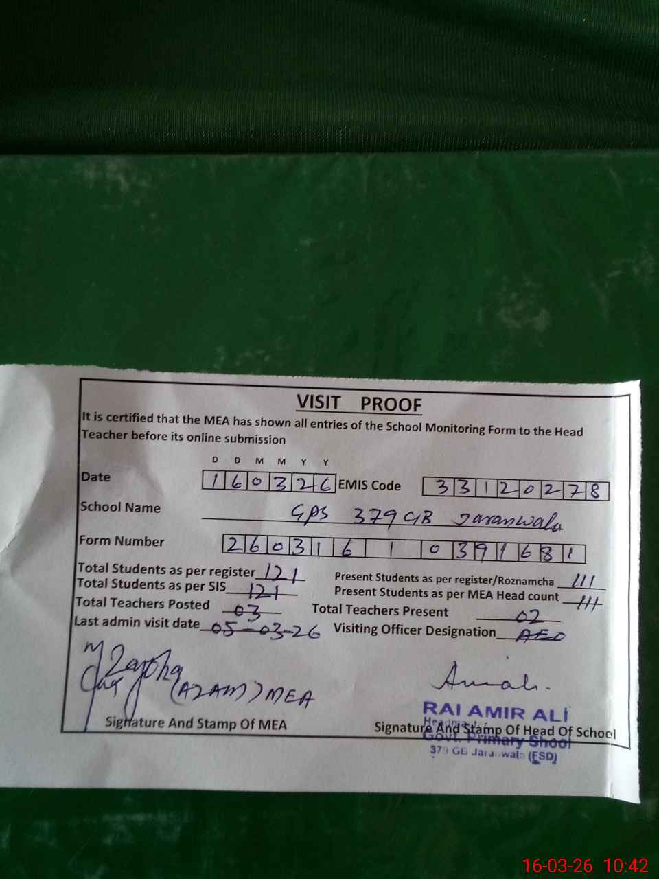 | Attendance Register | Head Teacher | MEA with School | Visit Proof |