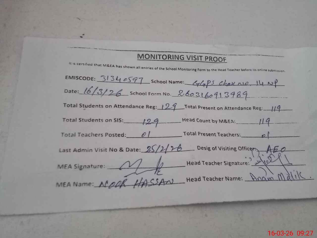 | Attendance Register | Head Teacher | MEA with School | Visit Proof |