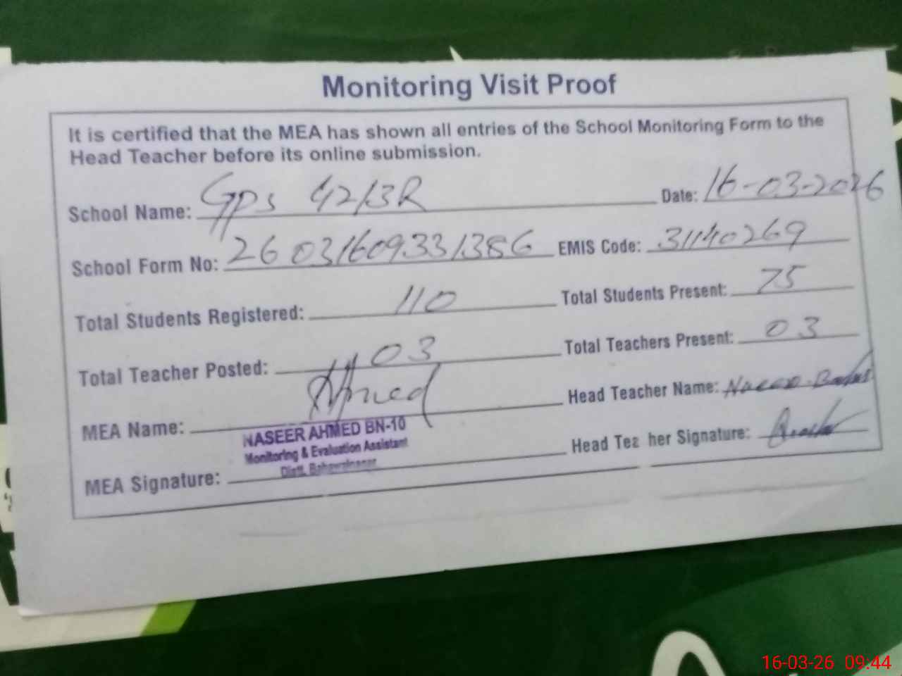 | EMIS Code: 31140269 | Name of School: GPS CHAK NO.42/3-R | |||