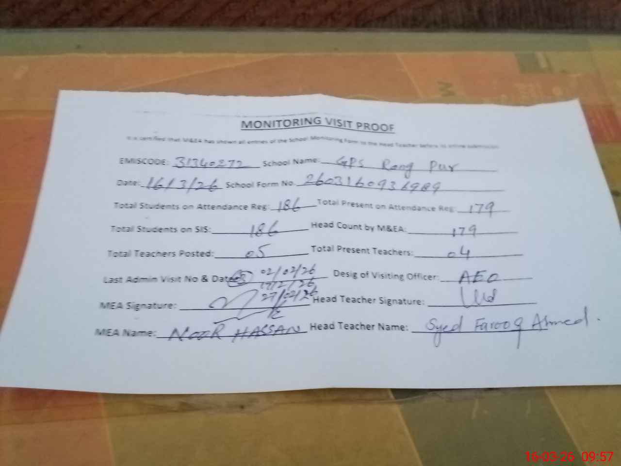| EMIS Code: 31340272 | Name of School: GPS RANG PUR | |||