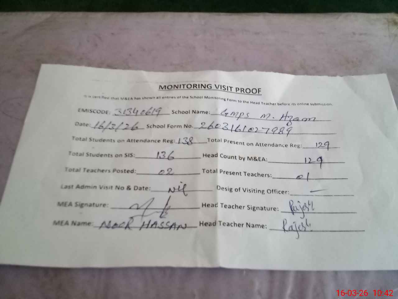 | Attendance Register | Head Teacher | MEA with School | Visit Proof |