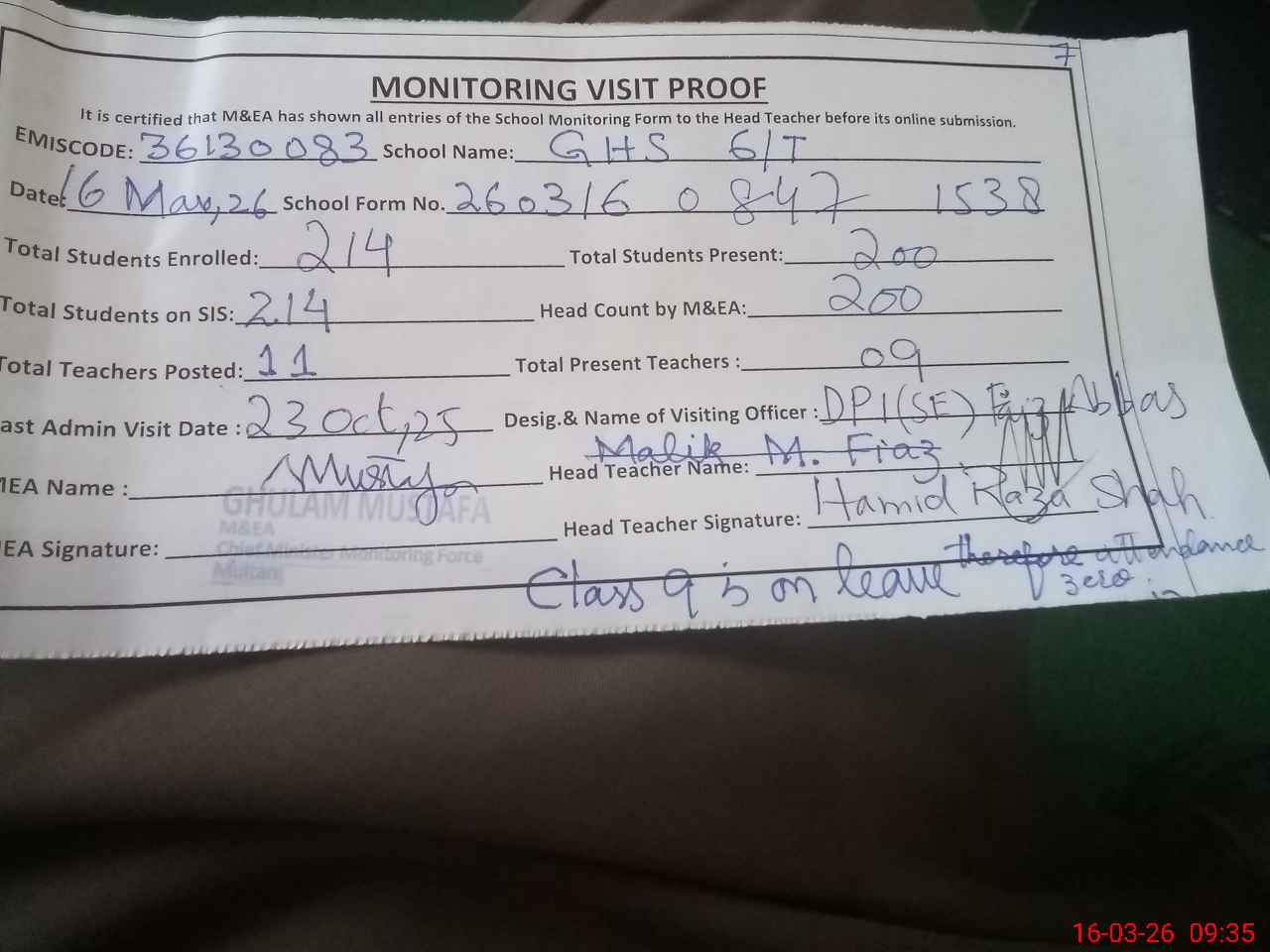 | Remarks (Use Separate Page if Required): class 9 is on leave therefore attendance zero 05 security cameras have been installed and are in operational state | |||||