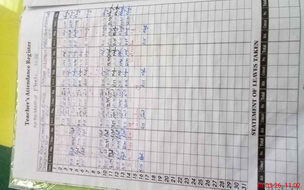 | Remarks (Use Separate Page if Required): ECCE and Nursery class have holidays. 1 to 7 classes exams are being conducted in school. Cash book for NSB record not properly maintained. | |||||