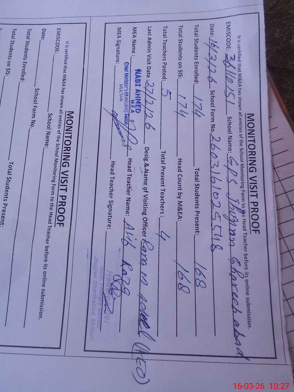 | EMIS Code: 36110151 | Name of School: GPS JHUGIAN GHAREEB ABAD MULTAN | |||