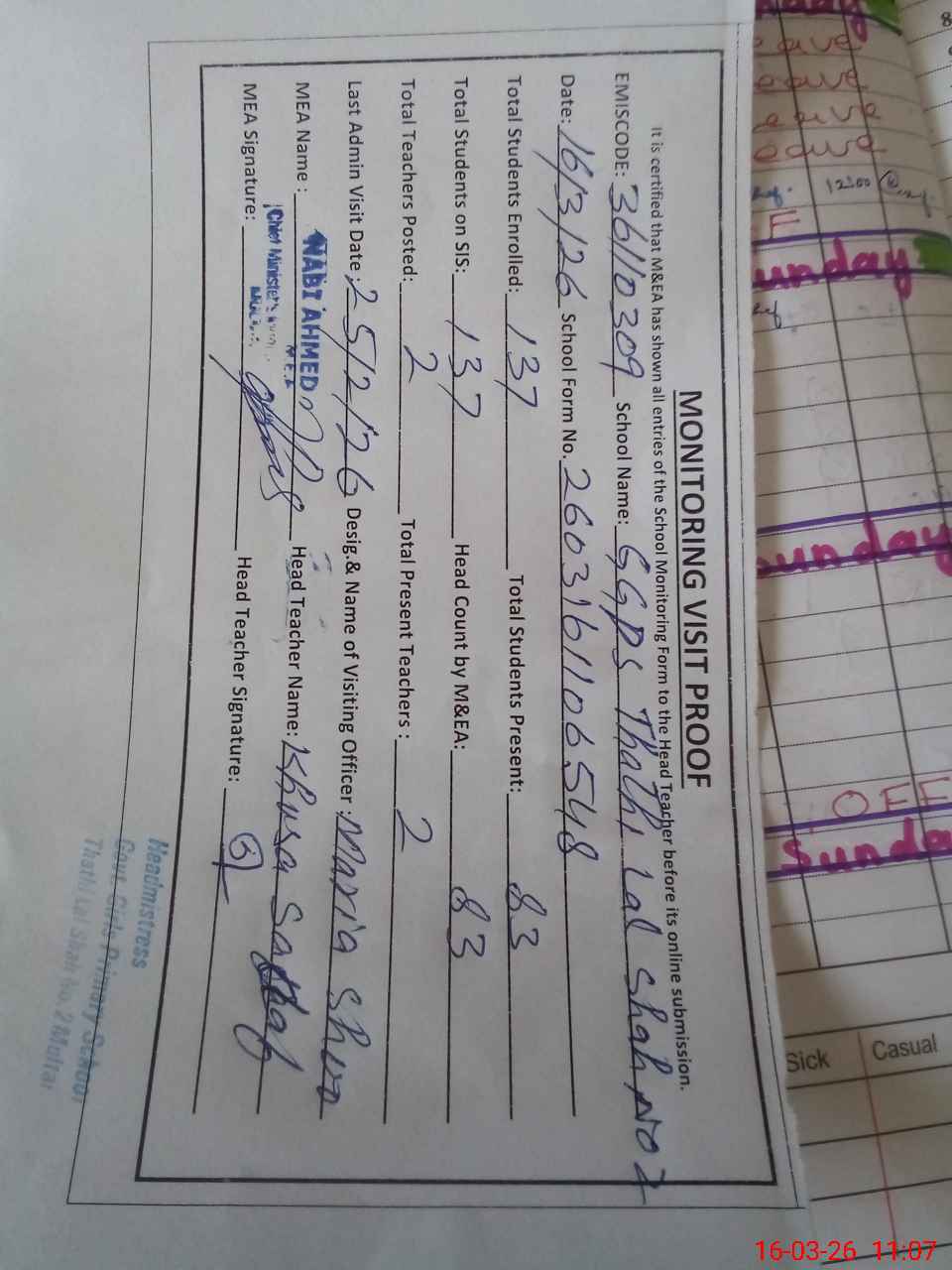 | EMIS Code: 36110309 | Name of School: GGPS THATHI LAL SHAH NO. 2 MULTAN | |||