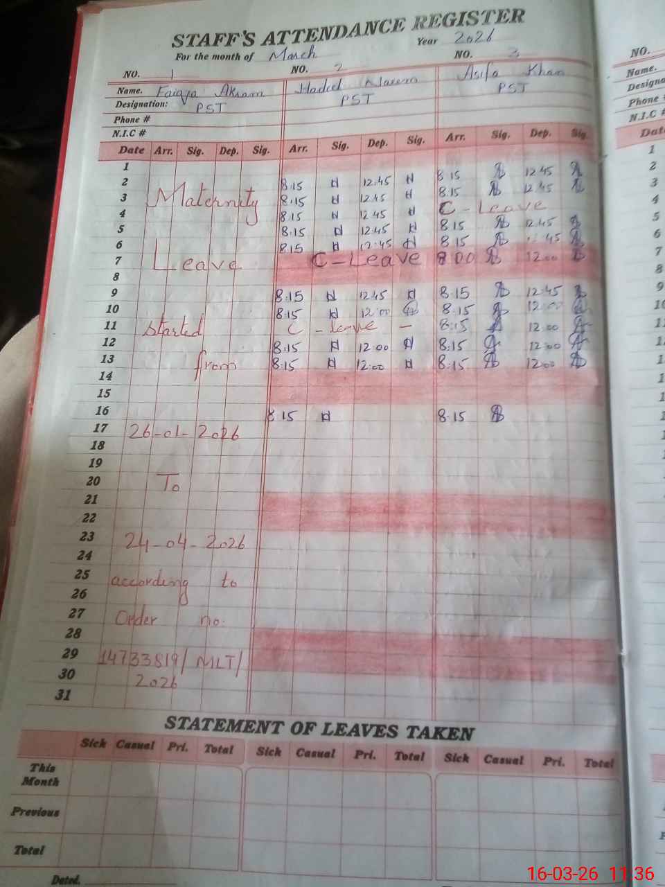 | Leave | Duty | Absent | Maternity | Medical | Ex- Pak |