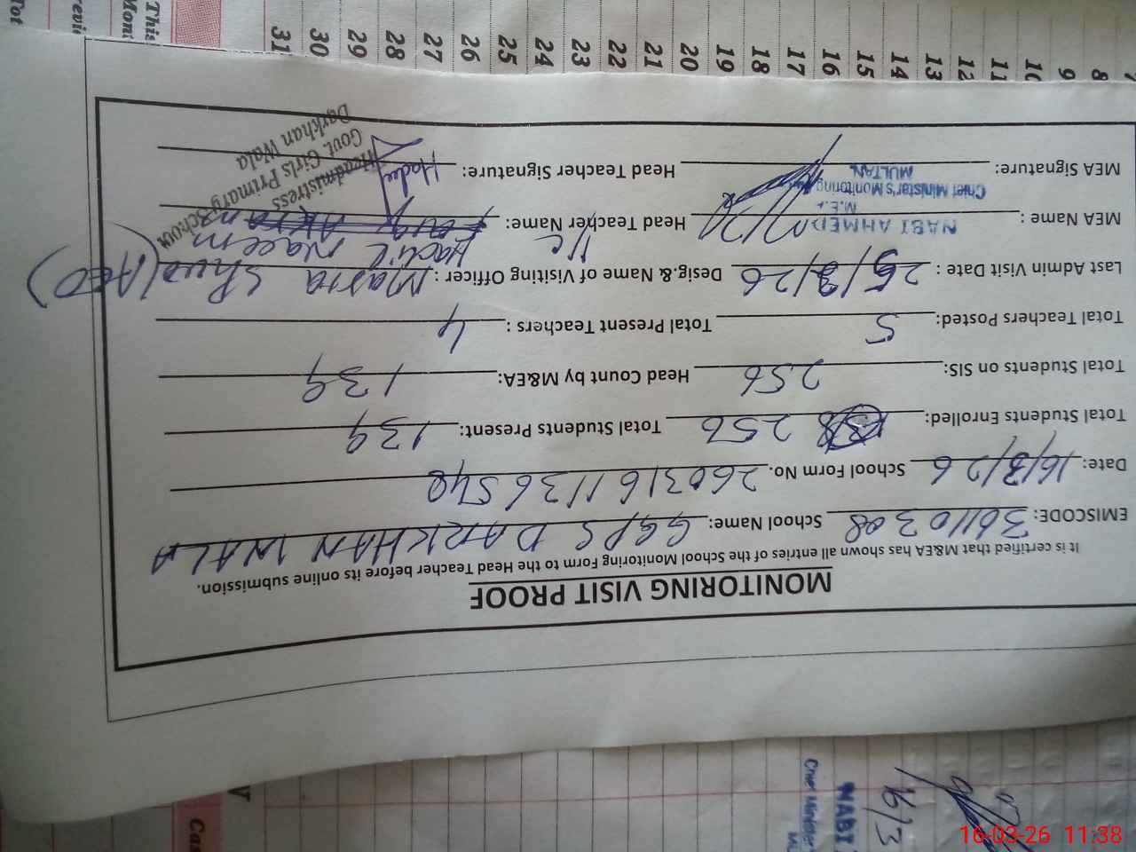 | Attendance Register | Head Teacher | MEA with School | Visit Proof |