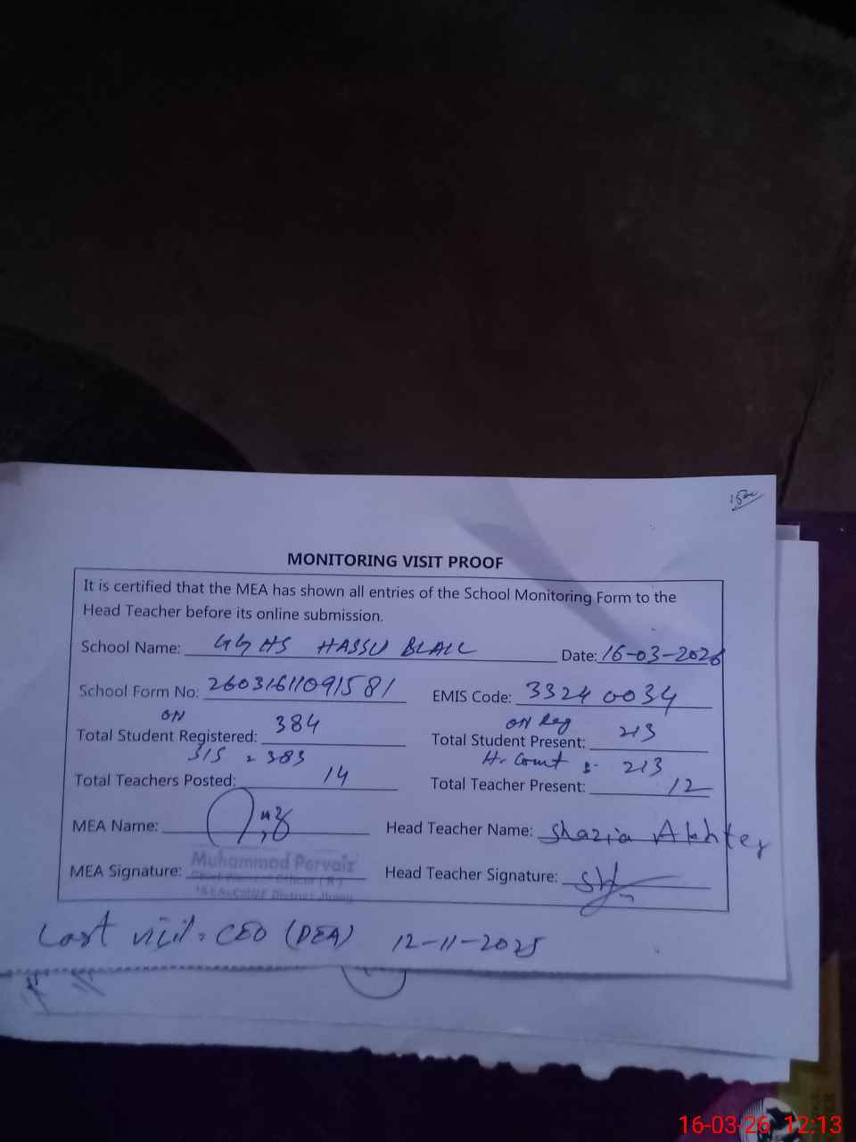 | Attendance Register | Head Teacher | MEA with School | Visit Proof |