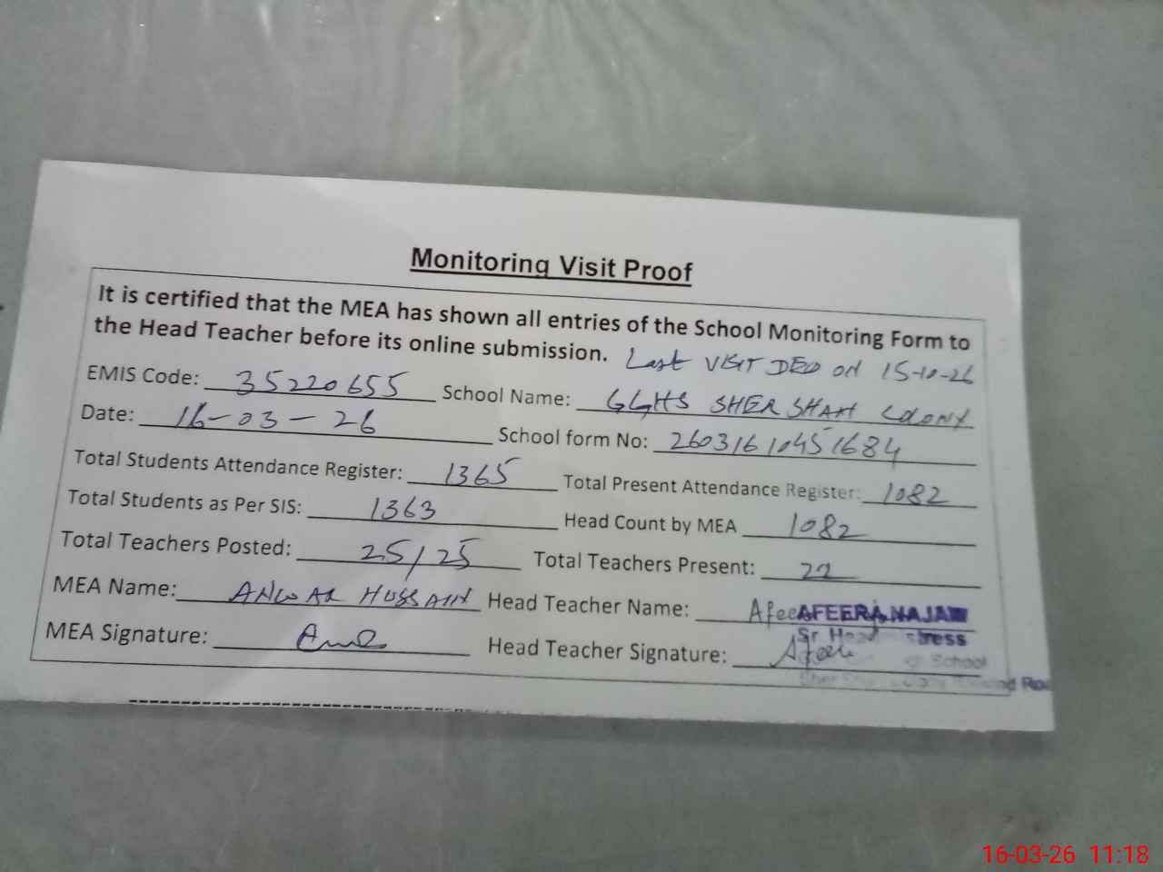 | EMIS Code: 35220655 | Name of School: GGHS SHER SHAH COLONY RAIWIND ROAD | |||