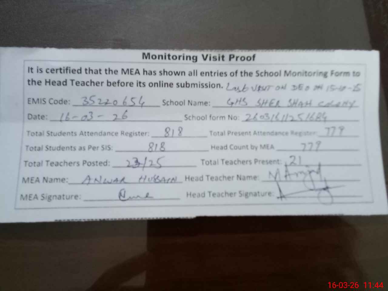 | Attendance Register | Head Teacher | MEA with School | Visit Proof |