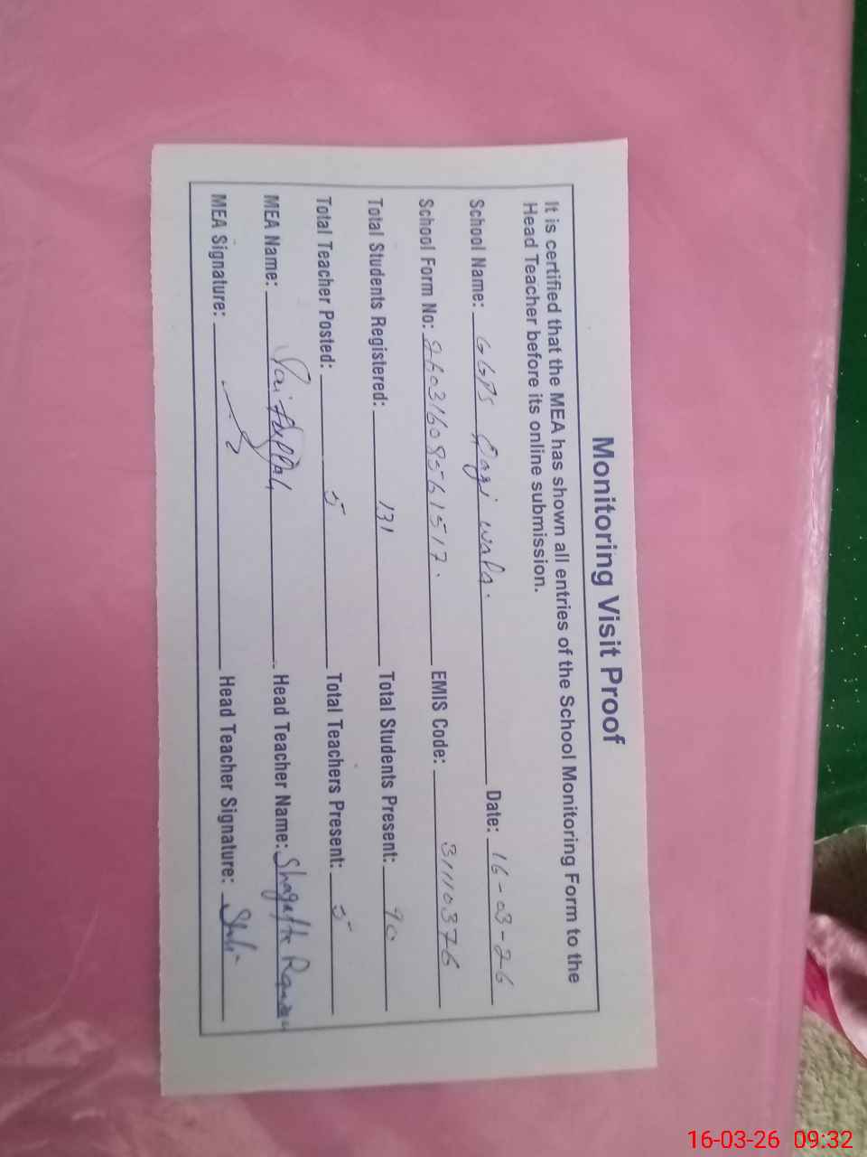 | Attendance Register | Head Teacher | MEA with School | Visit Proof |