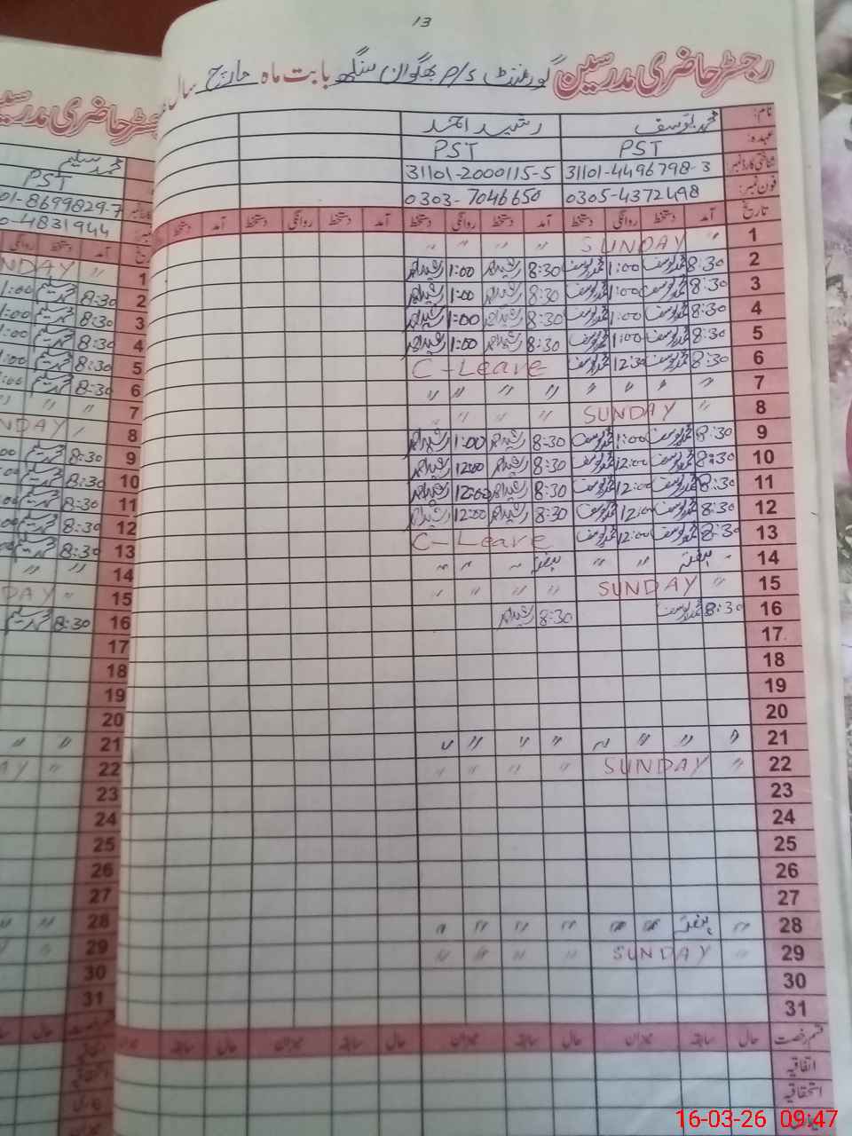 | CNIC | Full Name | Designation | R/C | Absence During Last Calender Month |