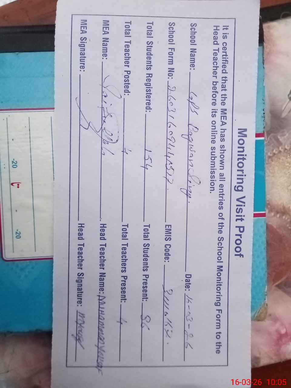 | Attendance Register | Head Teacher | MEA with School | Visit Proof |