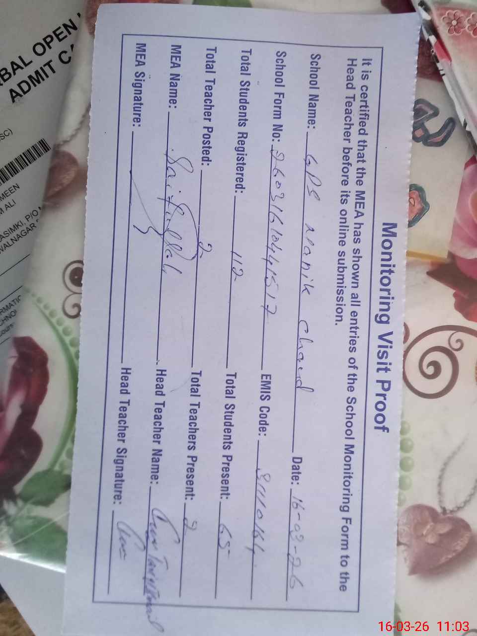 | Attendance Register | Head Teacher | MEA with School | Visit Proof |