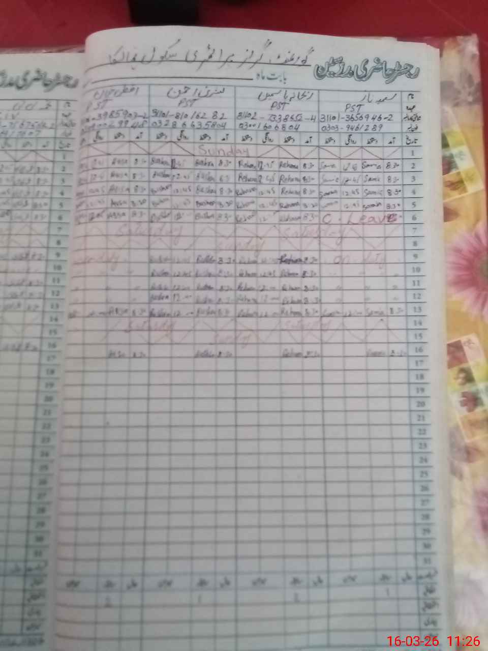 | 31**** | Ro**** Sh**** | EST Urdu | Regular | 1 | 0 | 0 | 0 | 0 | 0 | 0 | 0 | 1 | Absent (Un-Authorized) |