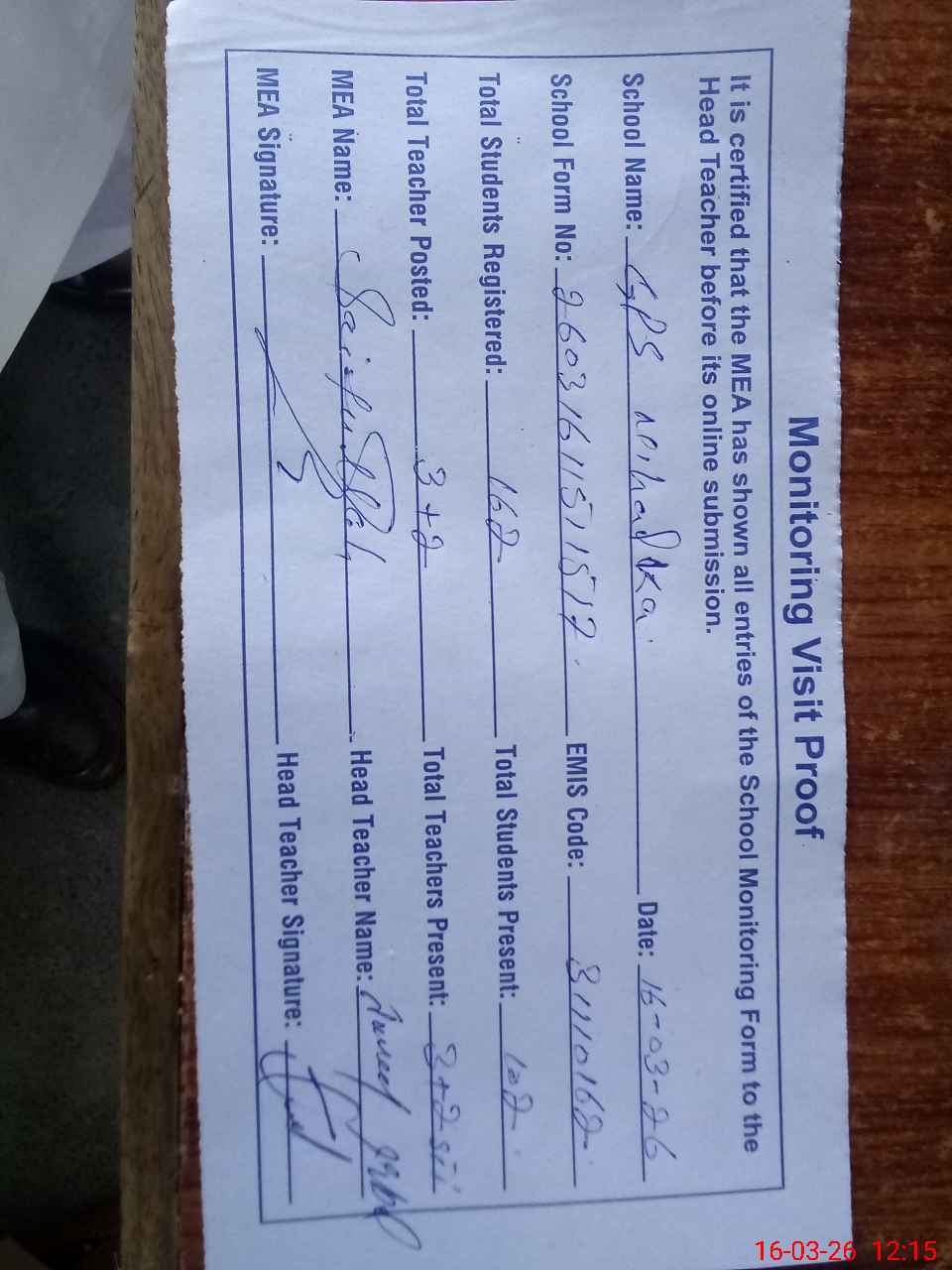 | Attendance Register | Head Teacher | MEA with School | Visit Proof |