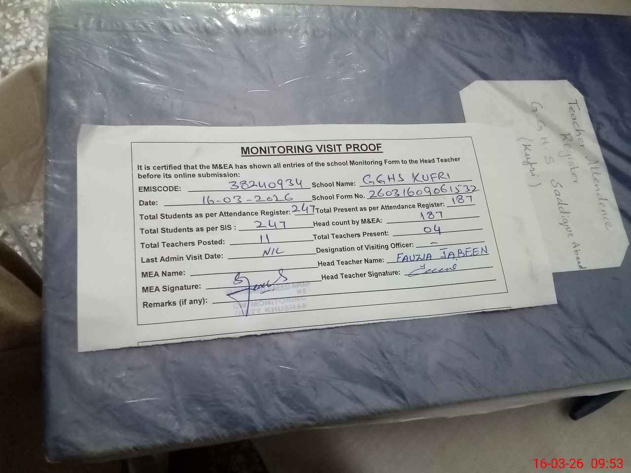 | Attendance Register | Head Teacher | MEA with School | Visit Proof |