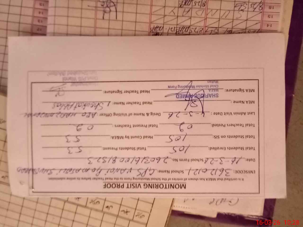 | Attendance Register | Head Teacher | MEA with School | Visit Proof |