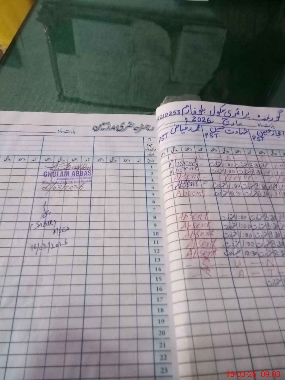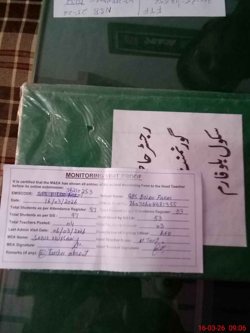 | Remarks (Use Separate Page if Required): 01teacher absent total students on register 97 total students on SiS 97 last admin visit by AEO on 06 Mar 2026 ECCE and Nursery classes are not present in school because these classes have no paper | |||||
