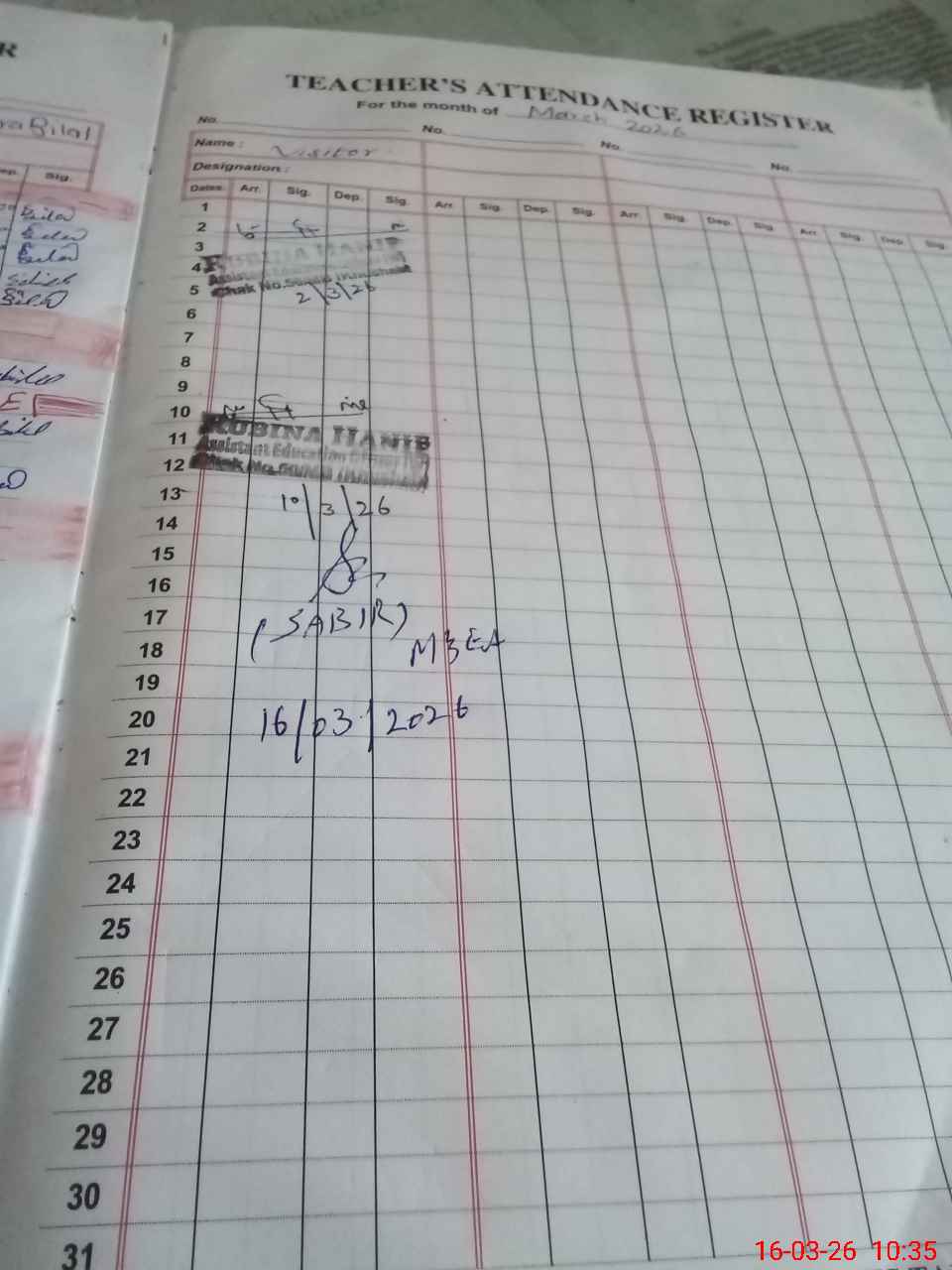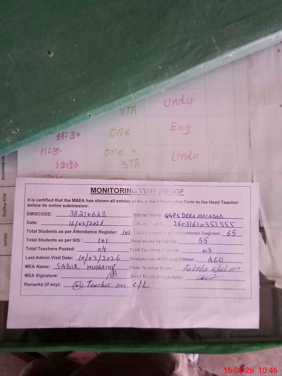 | Remarks (Use Separate Page if Required): no teacher absent total students on register 101 total students on SiS 101 last admin visit by AEO on 10 Mar 2026 class nursery has no paper so not present in school | |||||